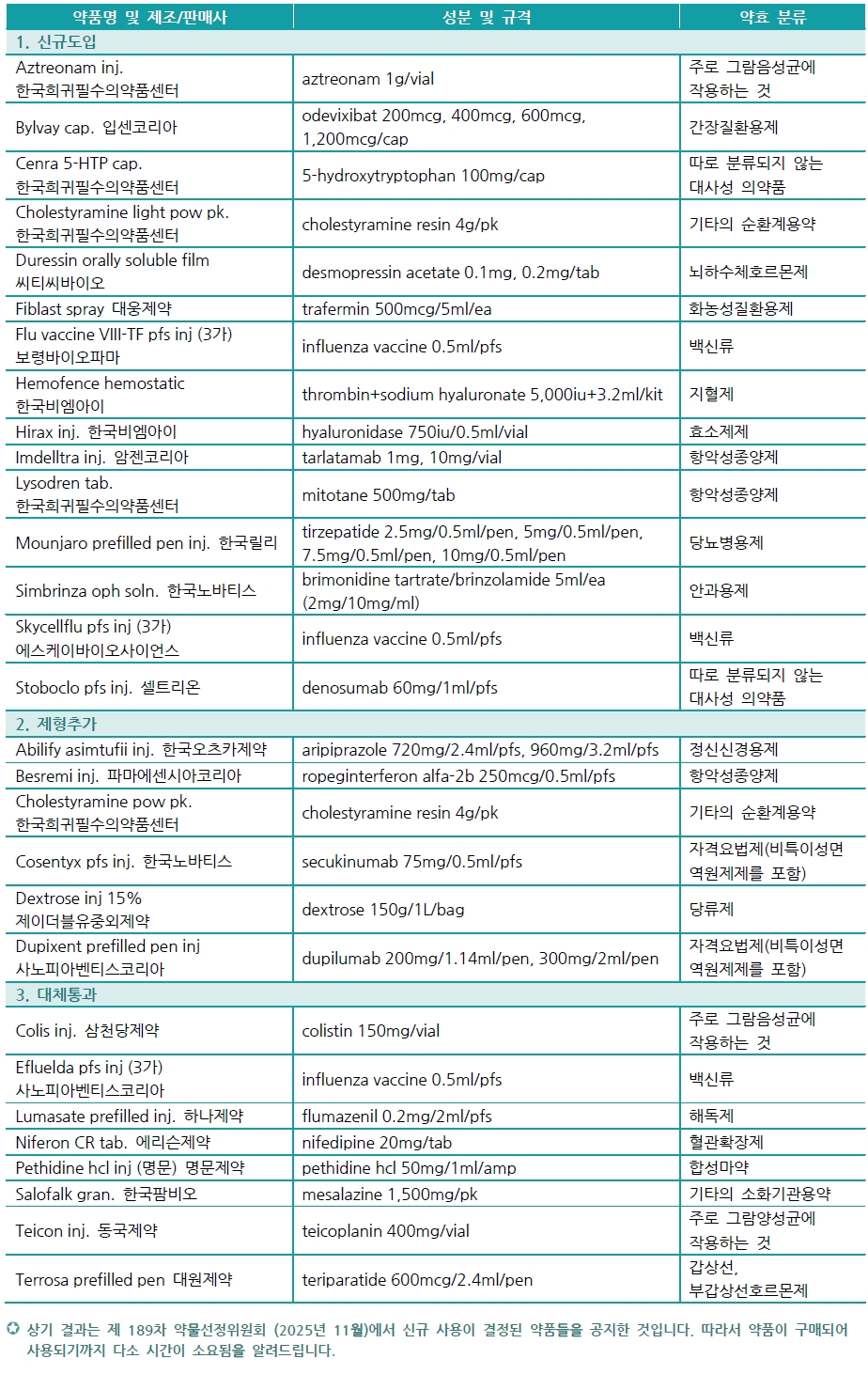 제 189차 약물선정위원회 결과 통과품목